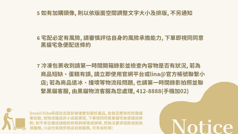 ❋ 冷凍包裹收到請第一時間開箱錄影並檢查內容物是否有狀況, 若為商品短缺、蛋糕有誤, 請立即使用官網平台或lina@官方帳號聯繫小店; 若為商品退冰、撞壞等物流段問題, 也請第一時間錄影拍照並聯繫黑貓客服, 由黑貓物流客服為您處理, 412-8888(手機加02)