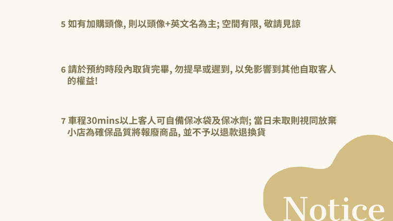 ❋ 請於預約時段內取貨完畢, 勿提早或遲到, 以免影響到其他自取客人的權益!