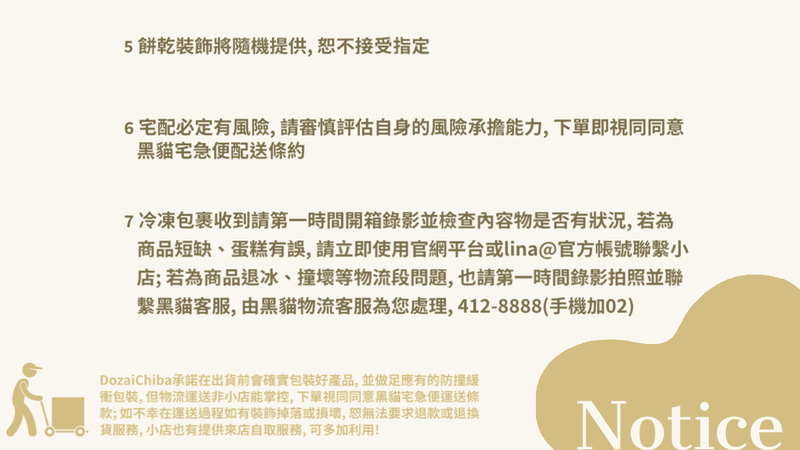 ❋ 冷凍包裹收到請第一時間開箱錄影並檢查內容物是否有狀況, 若為商品短缺、蛋糕有誤, 請立即使用官網平台或lina@官方帳號聯繫小店; 若為商品退冰、撞壞等物流段問題, 也請第一時間錄影拍照並聯繫黑貓客服, 由黑貓物流客服為您處理, 412-8888(手機加02)