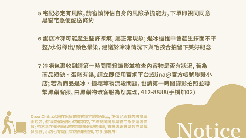 ❋ 冷凍包裹收到請第一時間開箱錄影並檢查內容物是否有狀況, 若為商品短缺、蛋糕有誤, 請立即使用官網平台或lina@官方帳號聯繫小店; 若為商品退冰、撞壞等物流段問題, 也請第一時間錄影拍照並聯繫黑貓客服, 由黑貓物流客服為您處理, 412-8888(手機加02)